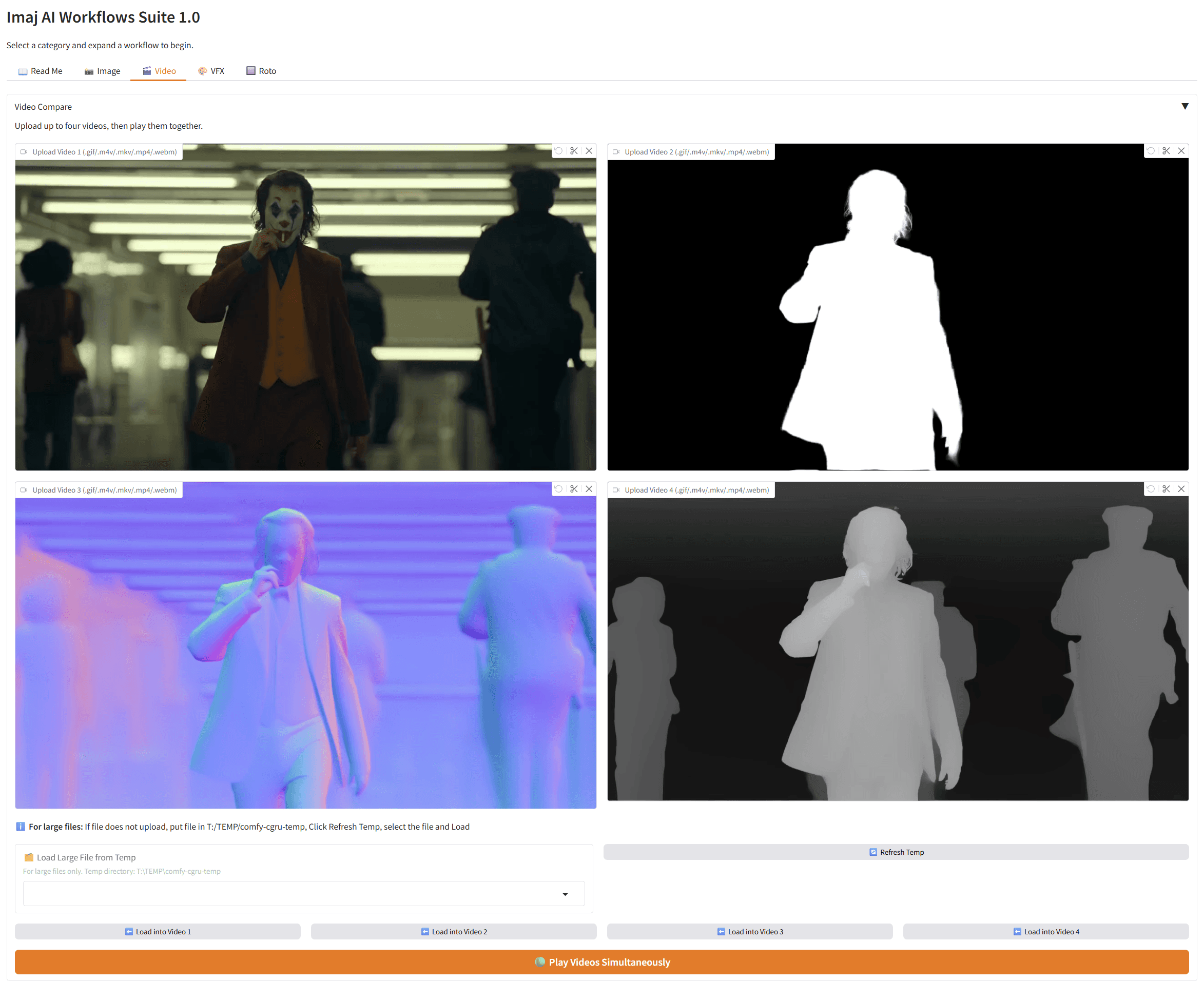 Software suite exclusive to Imaj Group. Enables our artists to choose from an ever-expanding repository of hybrid VFX / AI workflows and run AI-compute jobs locally via our private Render Farm. These workflows are integrated into our VFX pipelines, and models are deployed via our in-house full stack AI infrastructure